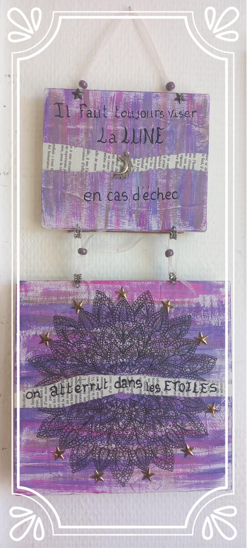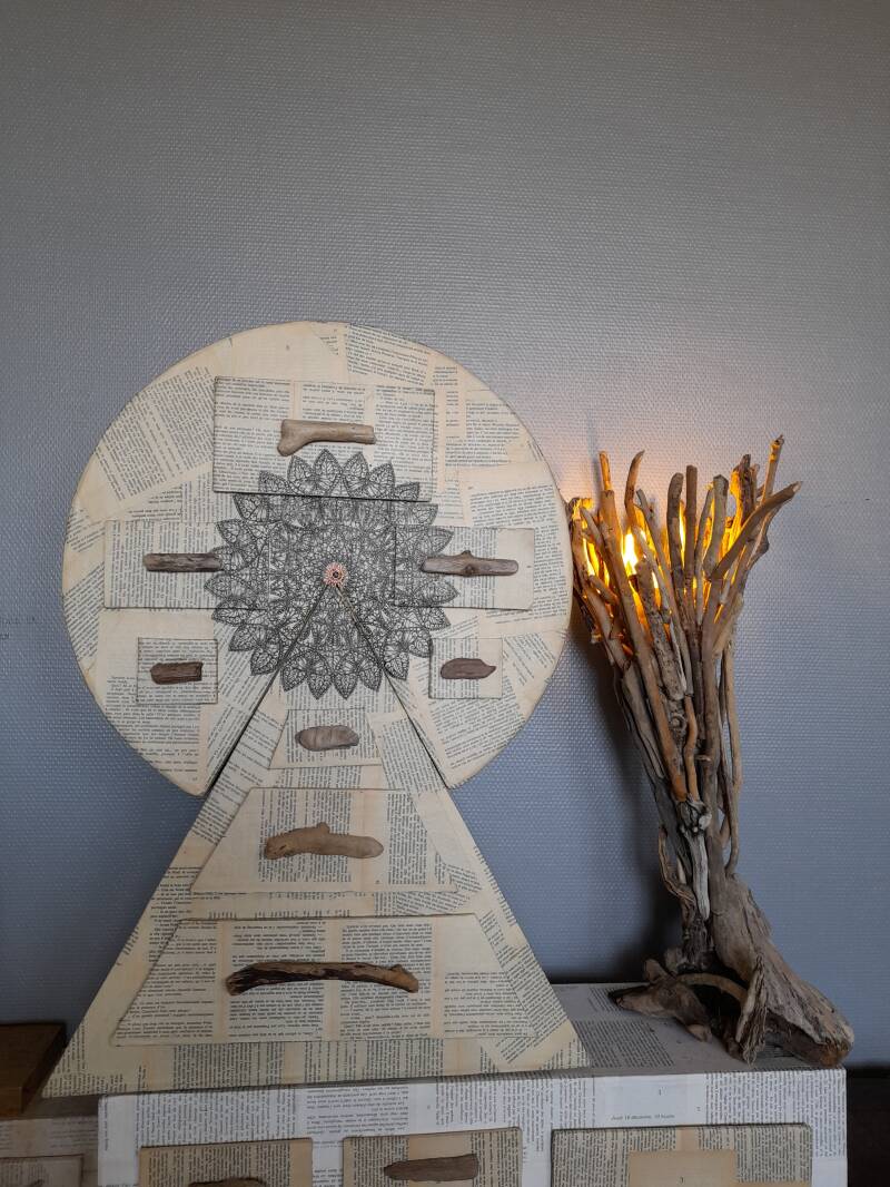 En 2012, je redécouvre le plaisirs de créer, suite à un burn out. Cette créativité est véritablement thérapeutique et le plus efficace des remèdes, pour moi. À l'époque je fabrique des bijoux, des attrape-rêves et des lampes en bois flottés.